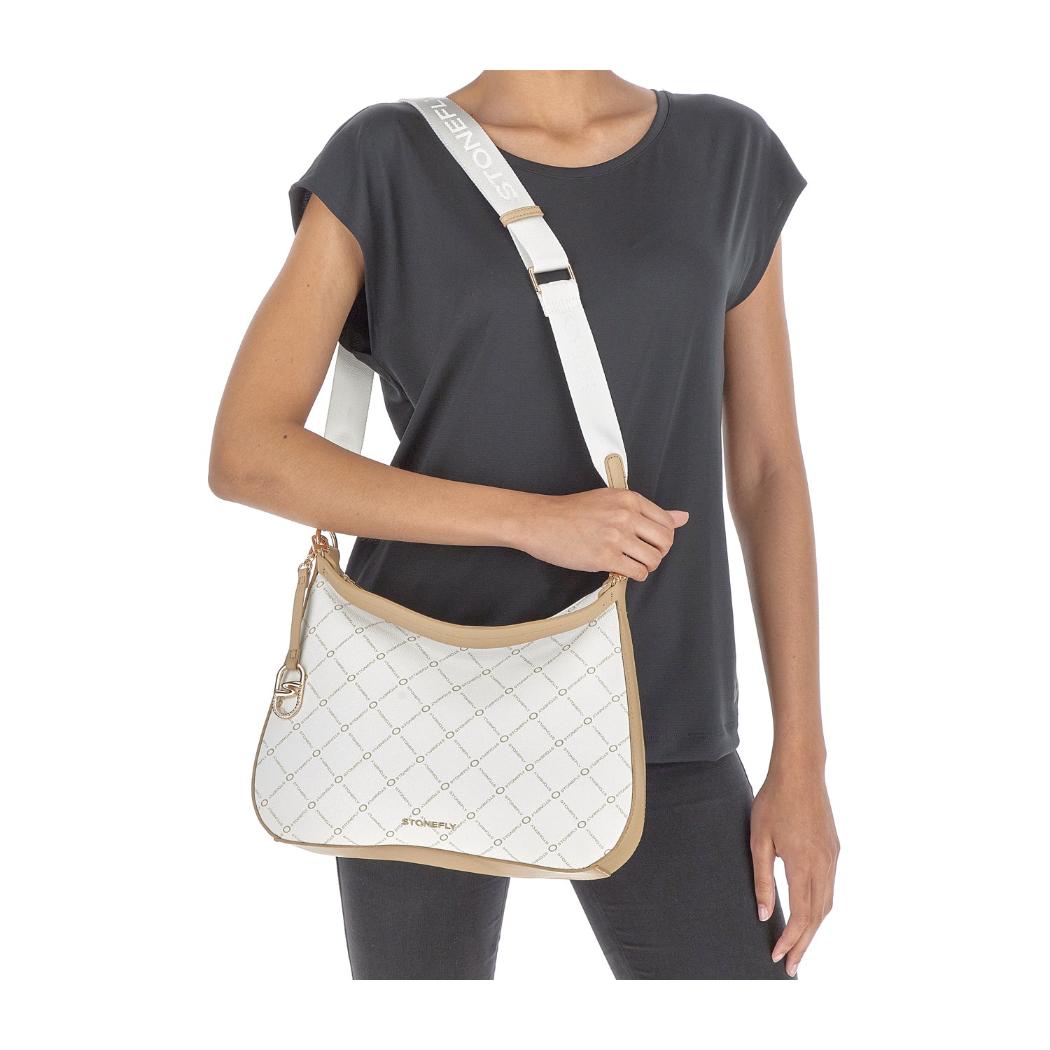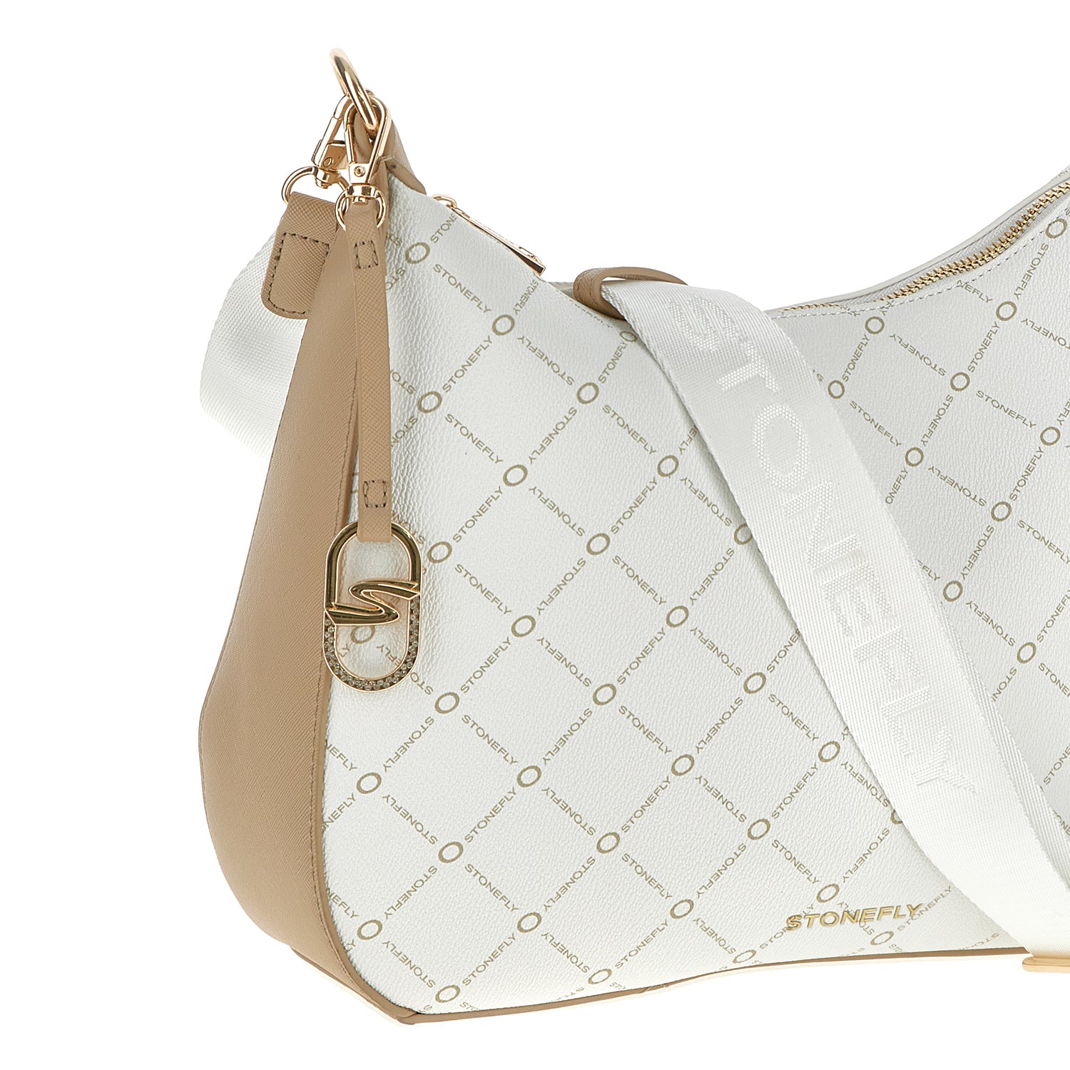 White synthetic leather hobo shoulder bag with Stonefly logo, pendant accessory and print.