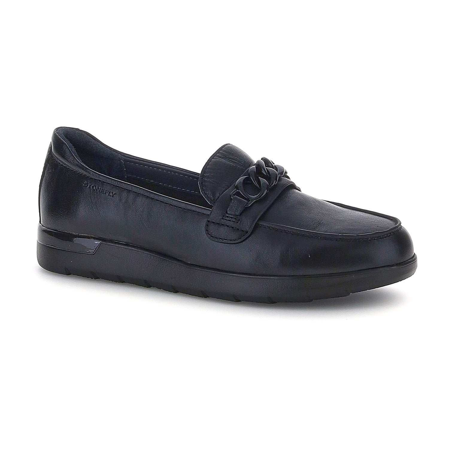 Mocasín para mujer en napa negro con ajuste regular. Este mocasín combina refinamiento y comodidad, con un diseño elegante y moderno a la vez. El detalle del accesorio con flecos le da un toque de originalidad, haciendo que este modelo sea ideal para quienes desean un zapato cómodo, pero sin renunciar al estilo. Perfecto para completar un look sofisticado y a la moda. La tecnología Blusoft® ofrece pasos suaves y ligeros como los de un gato, con un nivel inigualable de comodidad y amortiguación. Suela EVA, altura del tacón (cm): 3.