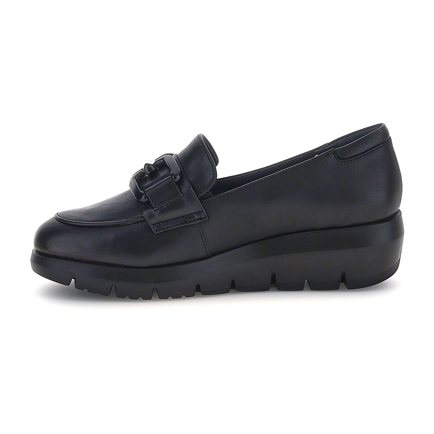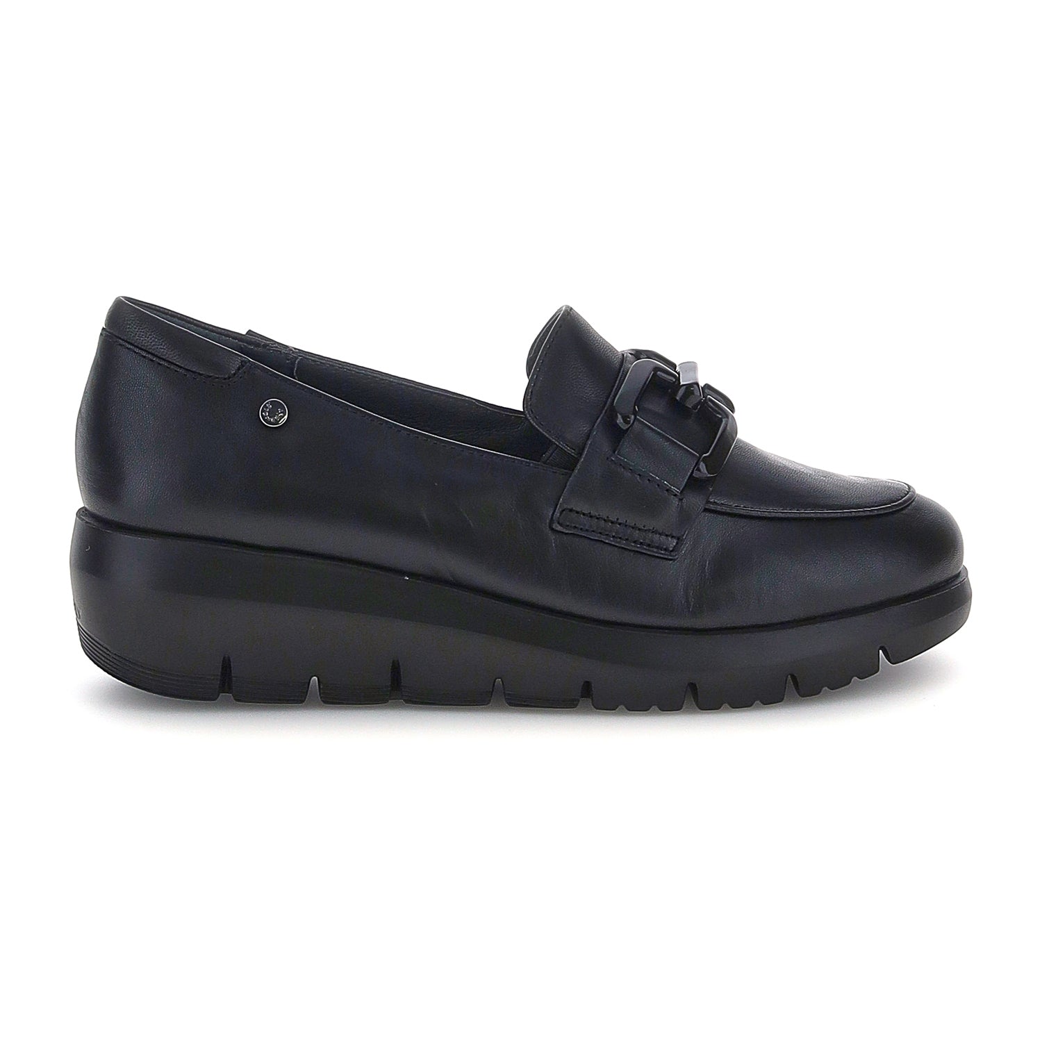 Mocassino da donna in pelle verniciata nera con vestibilità regular. Questo modello combina perfettamente la comodità della linea PLUME, caratterizzata da una suola confortevole e voluminosa, con l'eleganza e la classe del mocassino. Le linee semplici sono impreziosite dall'accessorio a catena, che conferisce un tocco sofisticato e ricercato a una calzatura versatile e alla moda. La tecnologia Blusoft® supporta la tua camminata garantendo massimo comfort e ammortizzazione. Suola in EVA, altezza tacco (cm): 4.5.
