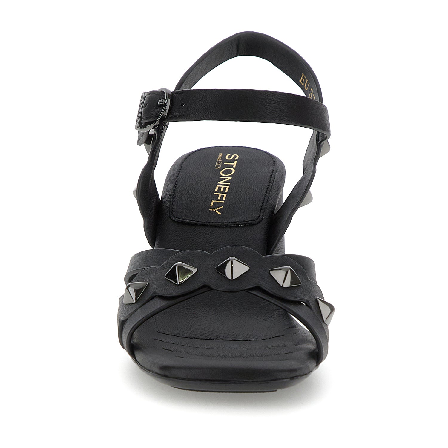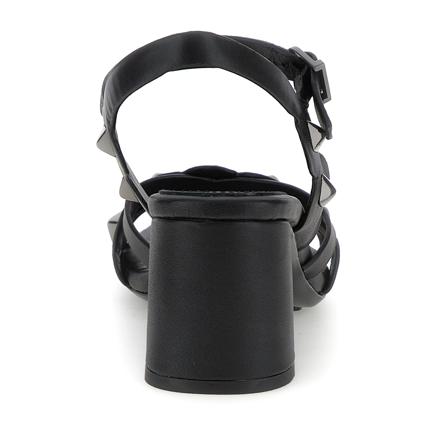 Sandalo con tacco da donna in pelle nappa nera con vestibilità slim. Un modello chic ed elegante, caratterizzato da una tomaia incrociata impreziosita dal dettaglio delle borchie. Il design ricercato del tacco aggiunge un tocco di personalità, rendendolo perfetto per completare con stile qualsiasi look sofisticato. La calzatura incorpora la tecnologia Second Skin® che rende le scarpe morbide e leggere, proprio come indossare una seconda pelle. Suola in PU, altezza tacco (cm): 5.5.