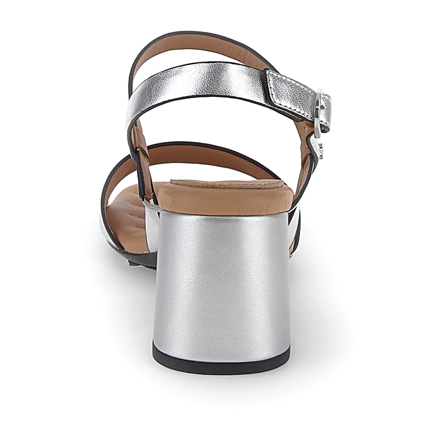Sandalo con tacco da donna in pelle laminata argento con vestibilità slim. Un modello dal design semplice ma elegante, ideale per completare i tuoi outfit estivi con stile. Perfetto per aggiungere un tocco di raffinatezza a qualsiasi look, unisce eleganza e versatilità per ogni occasione. Il design ricercato del tacco aggiunge un tocco di personalità, rendendolo perfetto per completare qualsiasi look sofisticato. La calzatura incorpora la tecnologia Second Skin® che rende le scarpe morbide e leggere, proprio come indossare una seconda pelle. Suola in PU, altezza tacco (cm): 5.5.