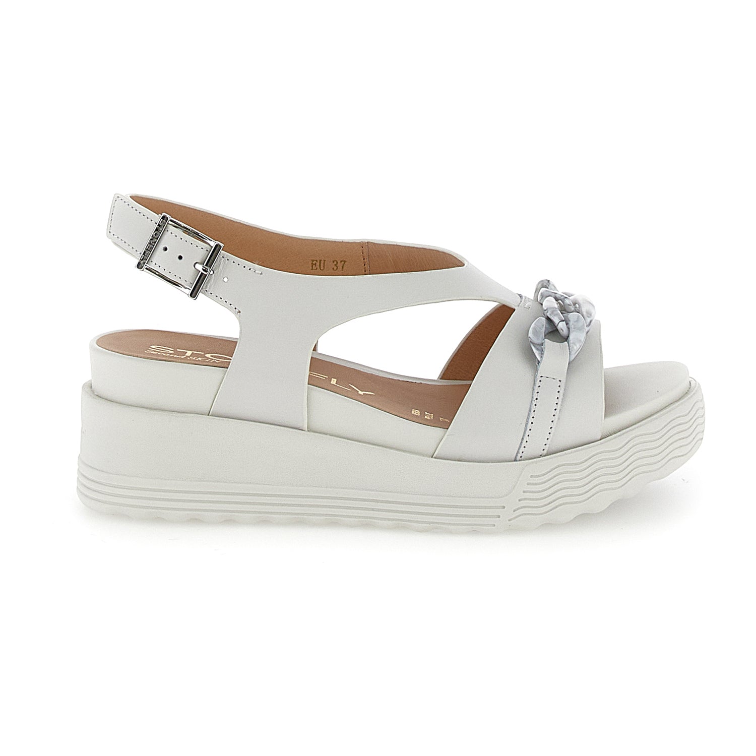 Sandalo con zeppa da donna in pelle bianca con vestibilità regular. Questo modello è chic e confortevole, perfetto per ogni tuo look estivo, dal più casual al più elegante. È arricchito dal dettaglio dell'accessorio a catena ton sur ton nella parte anteriore della tomaia. La calzatura incorpora la tecnologia Second Skin® che rende le scarpe morbide e leggere, proprio come indossare una seconda pelle.