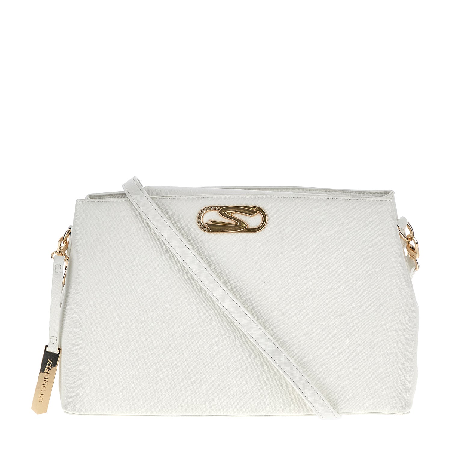 White synthetic leather shoulder bag with Stonefly monogram logo, pendant accessory, and chain.