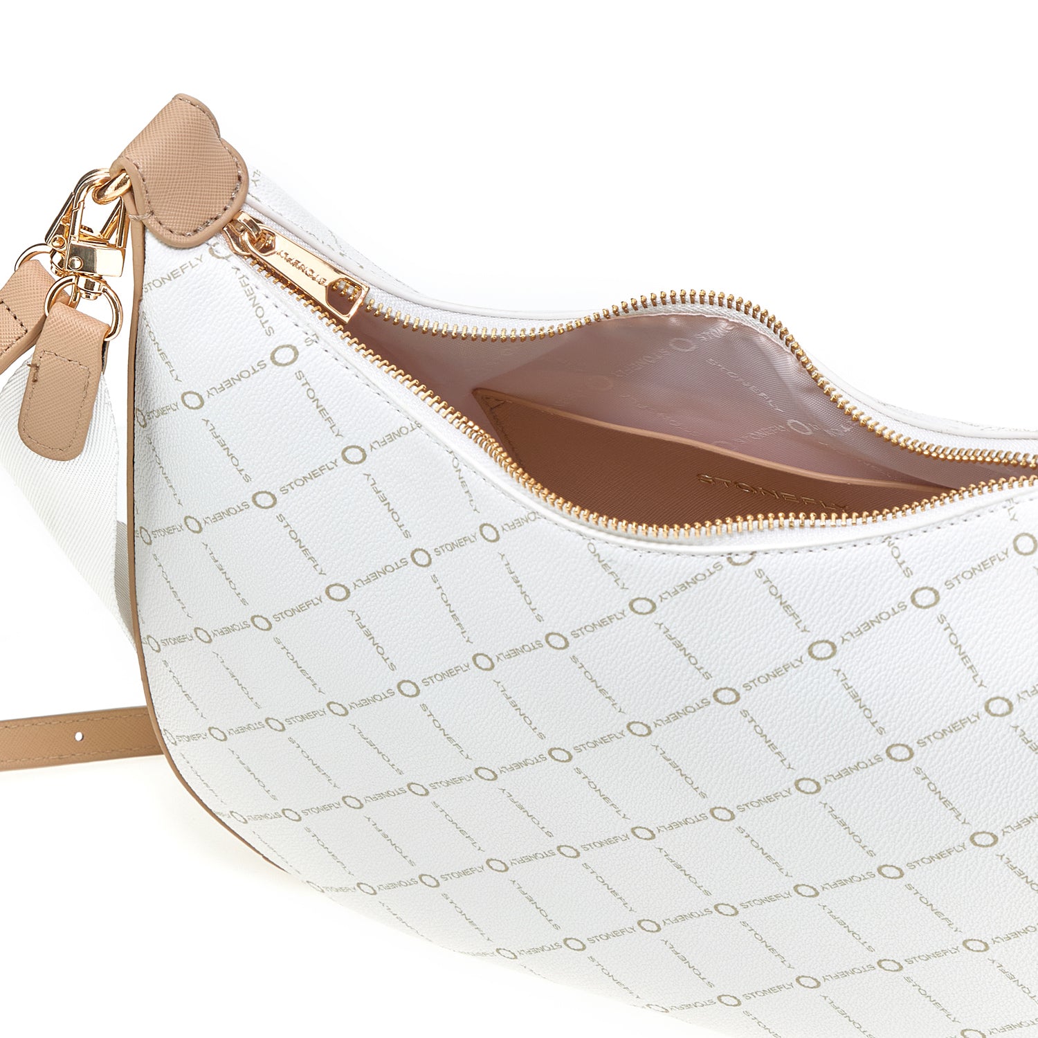 White synthetic leather hobo shoulder bag with Stonefly logo, pendant accessory and print.
