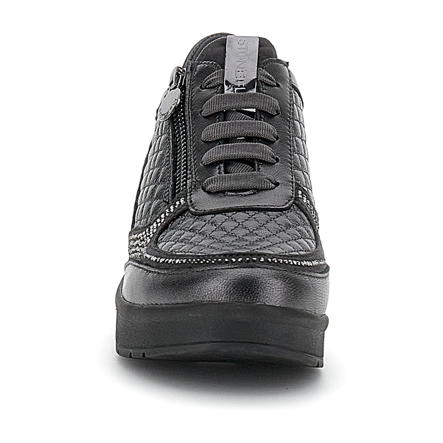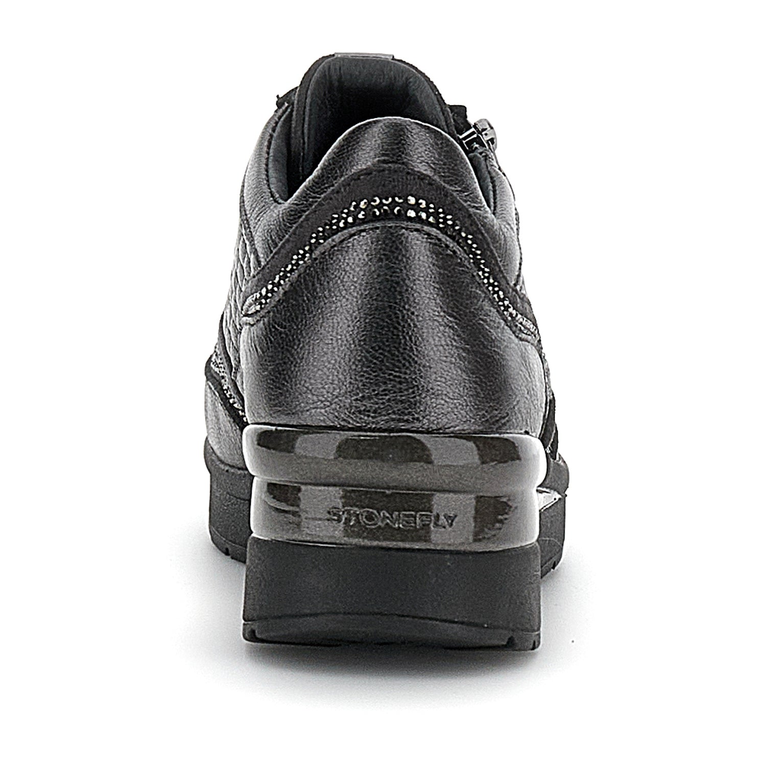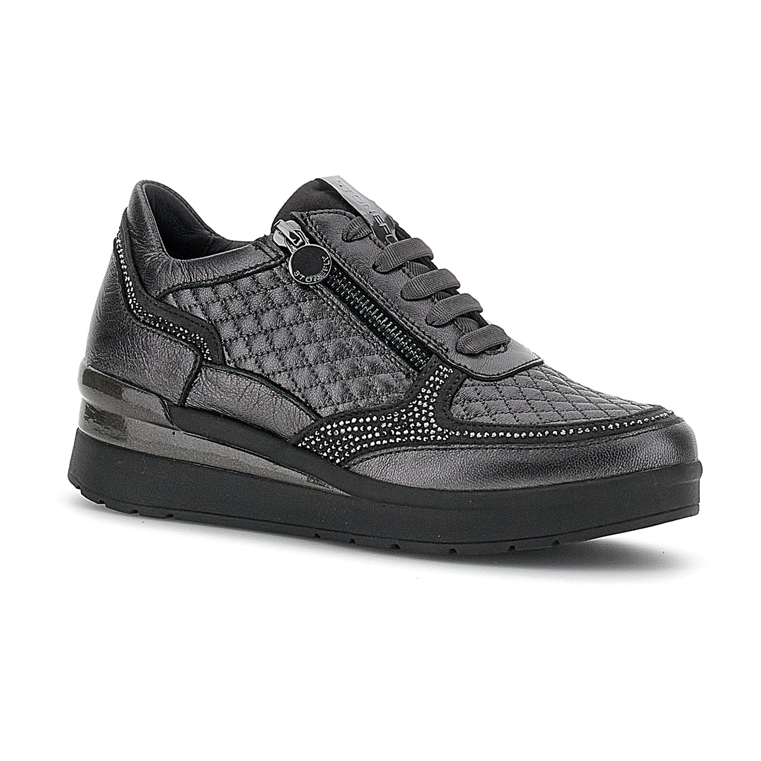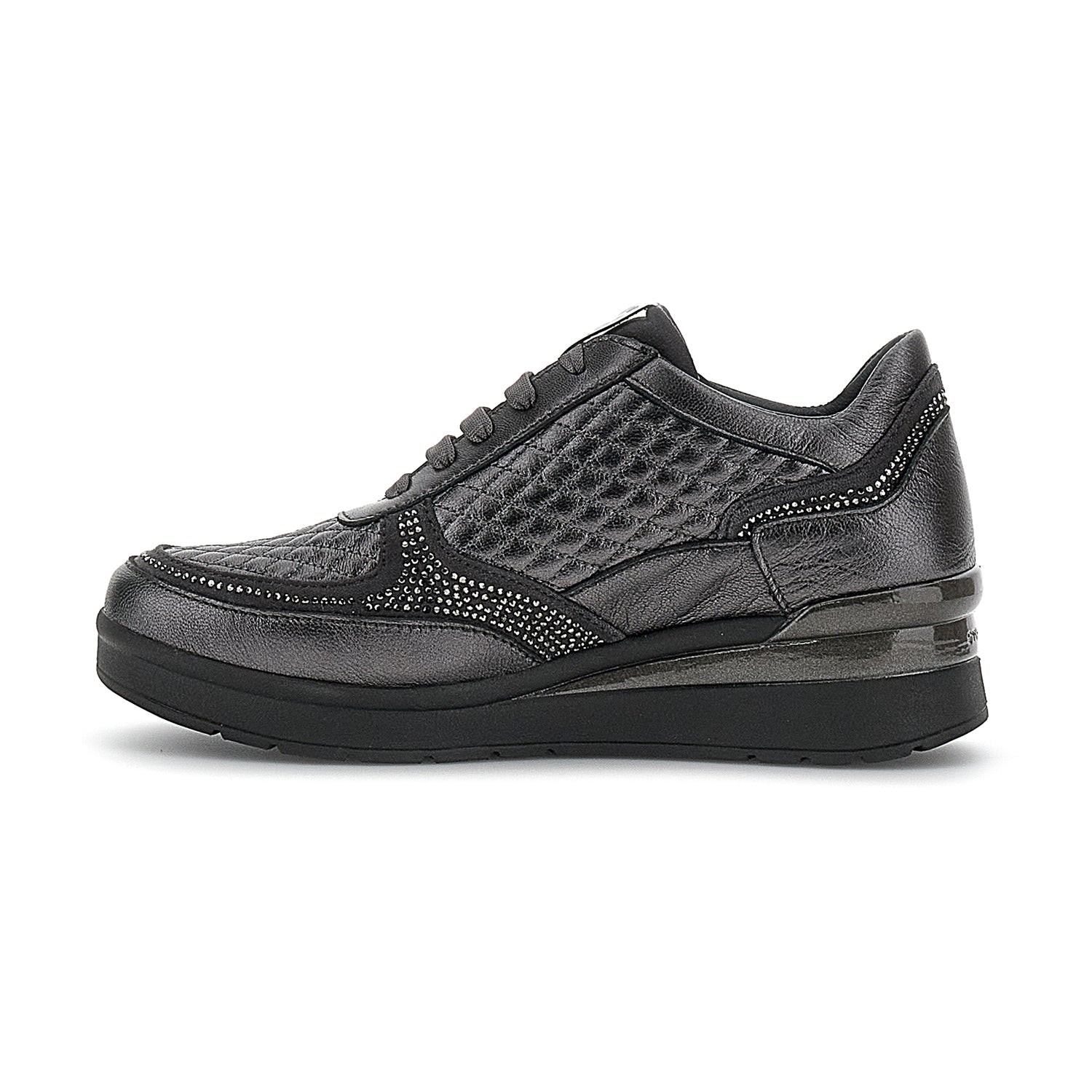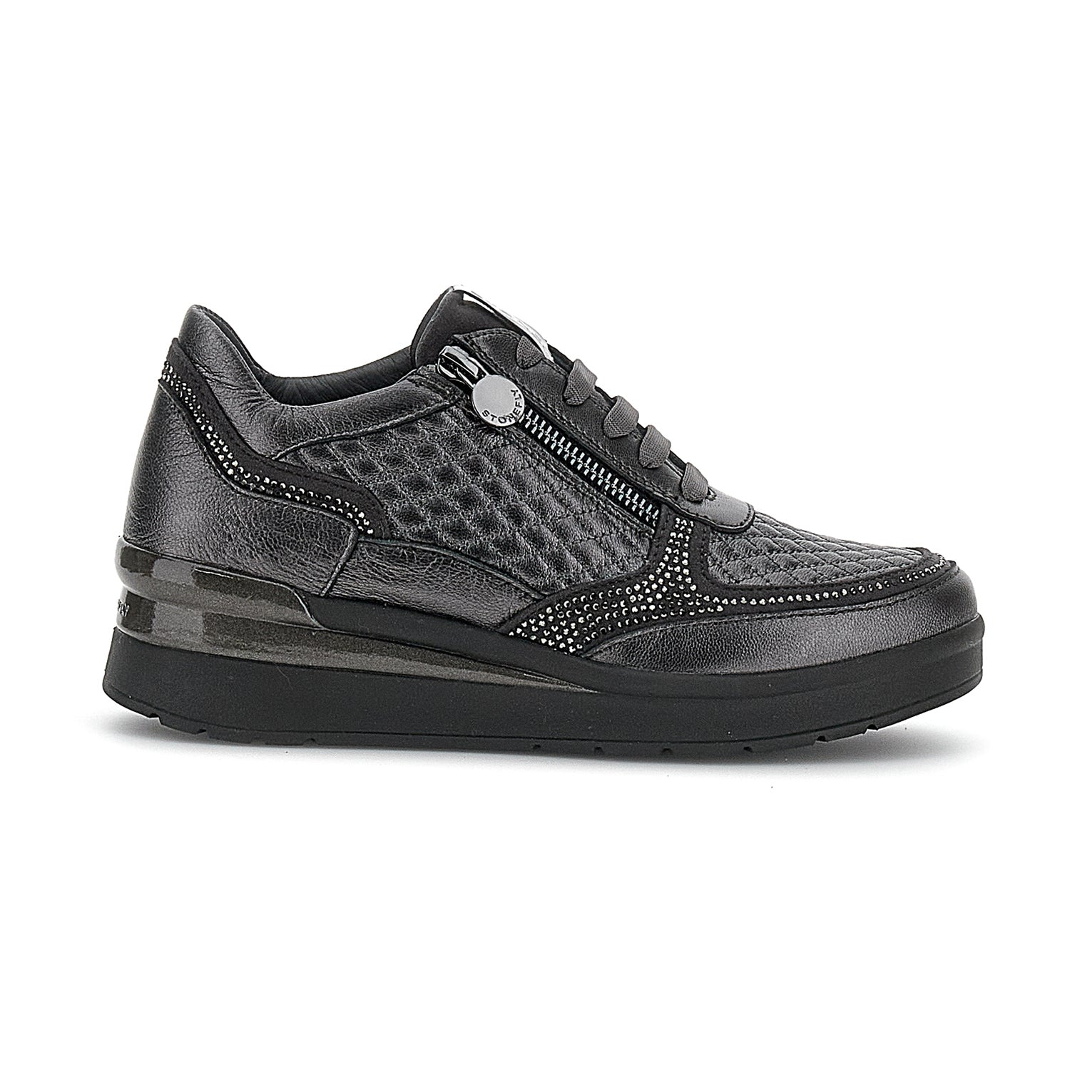 Women's lace-up shoes in gray laminated leather with a regular fit. Featuring a soft quilted-effect upper, enhanced with rhinestone details, this model is extremely comfortable and versatile, perfect for accompanying you with style and lightness throughout your day. The side zip closure makes slipping on easier and quicker for maximum convenience. Blusoft® technology supports your walk, providing maximum comfort and cushioning. EVA sole, heel height (cm): 5.