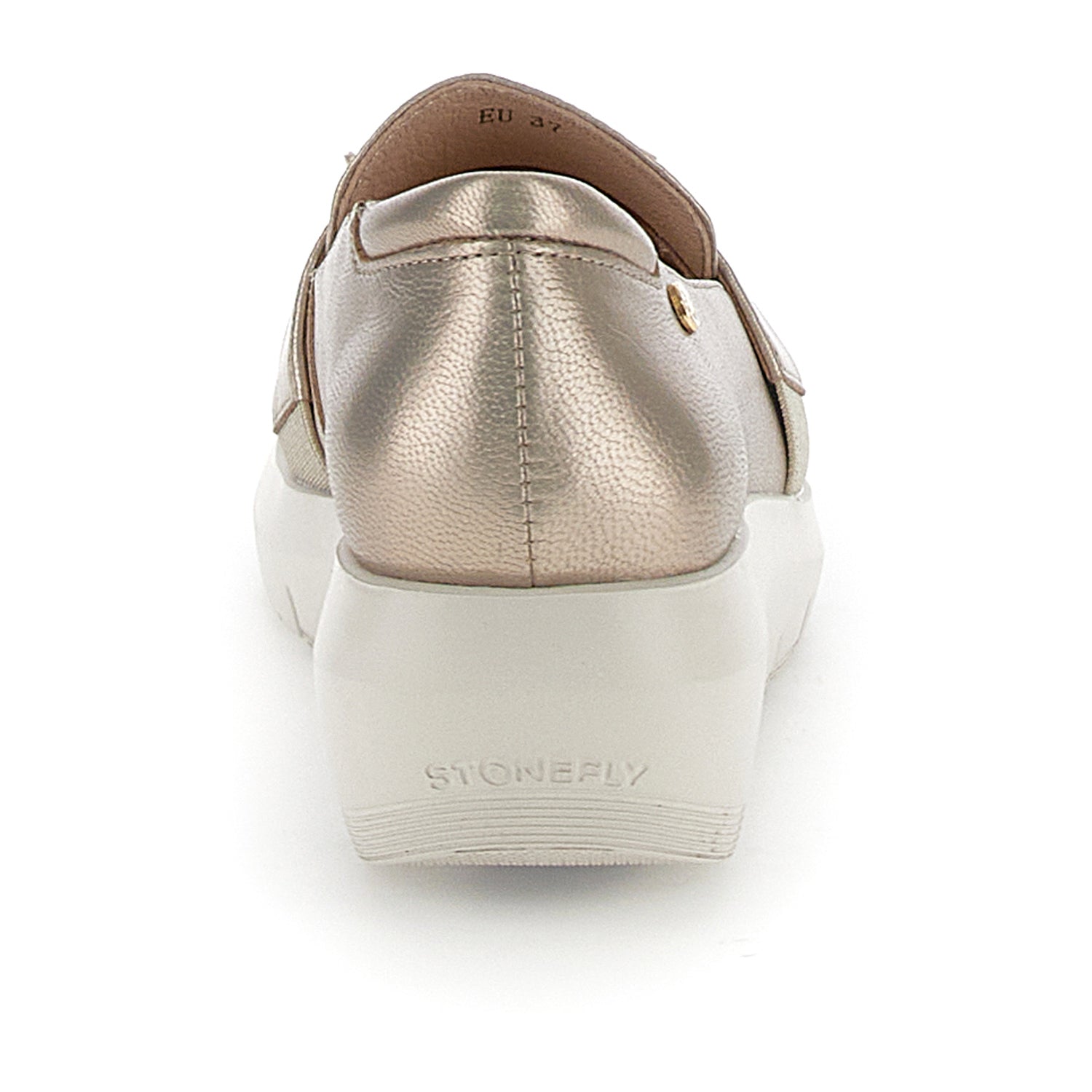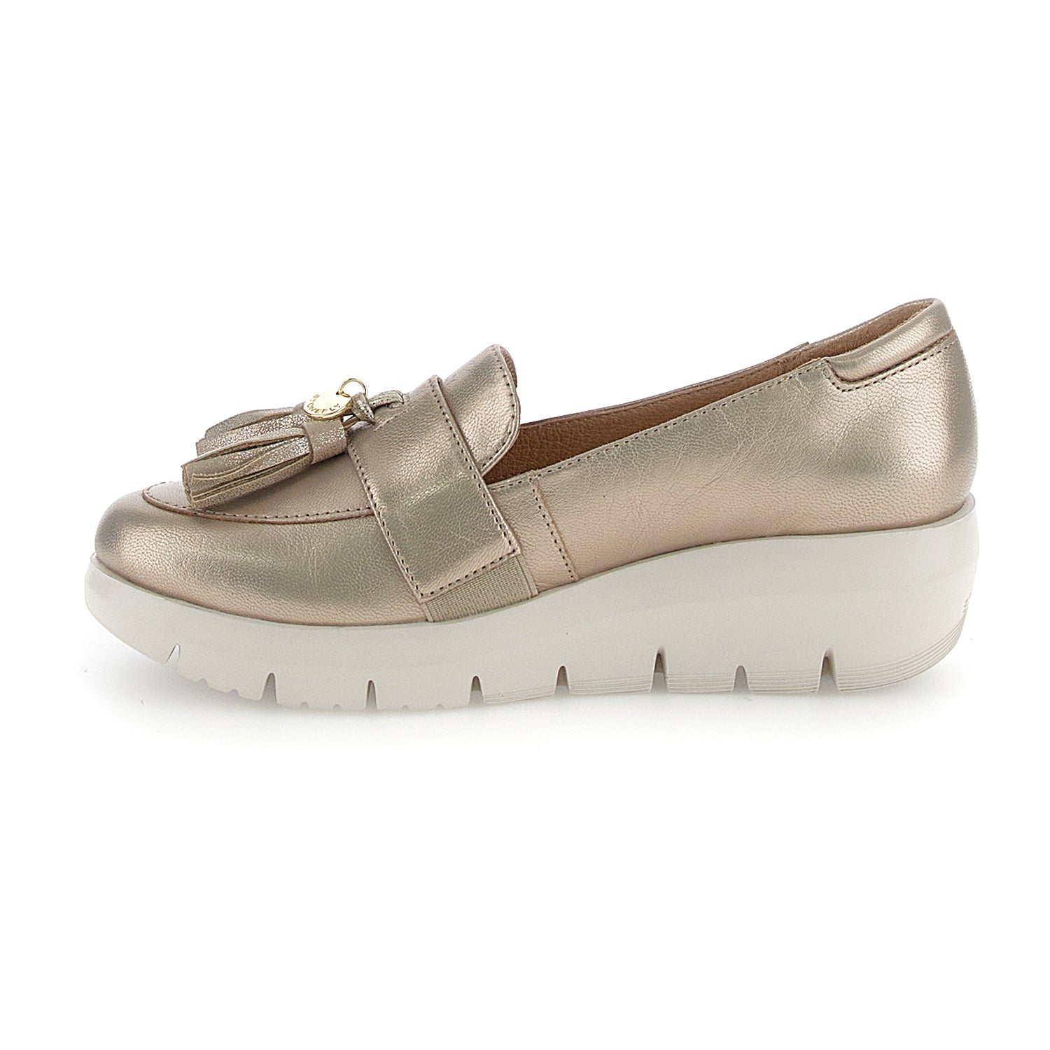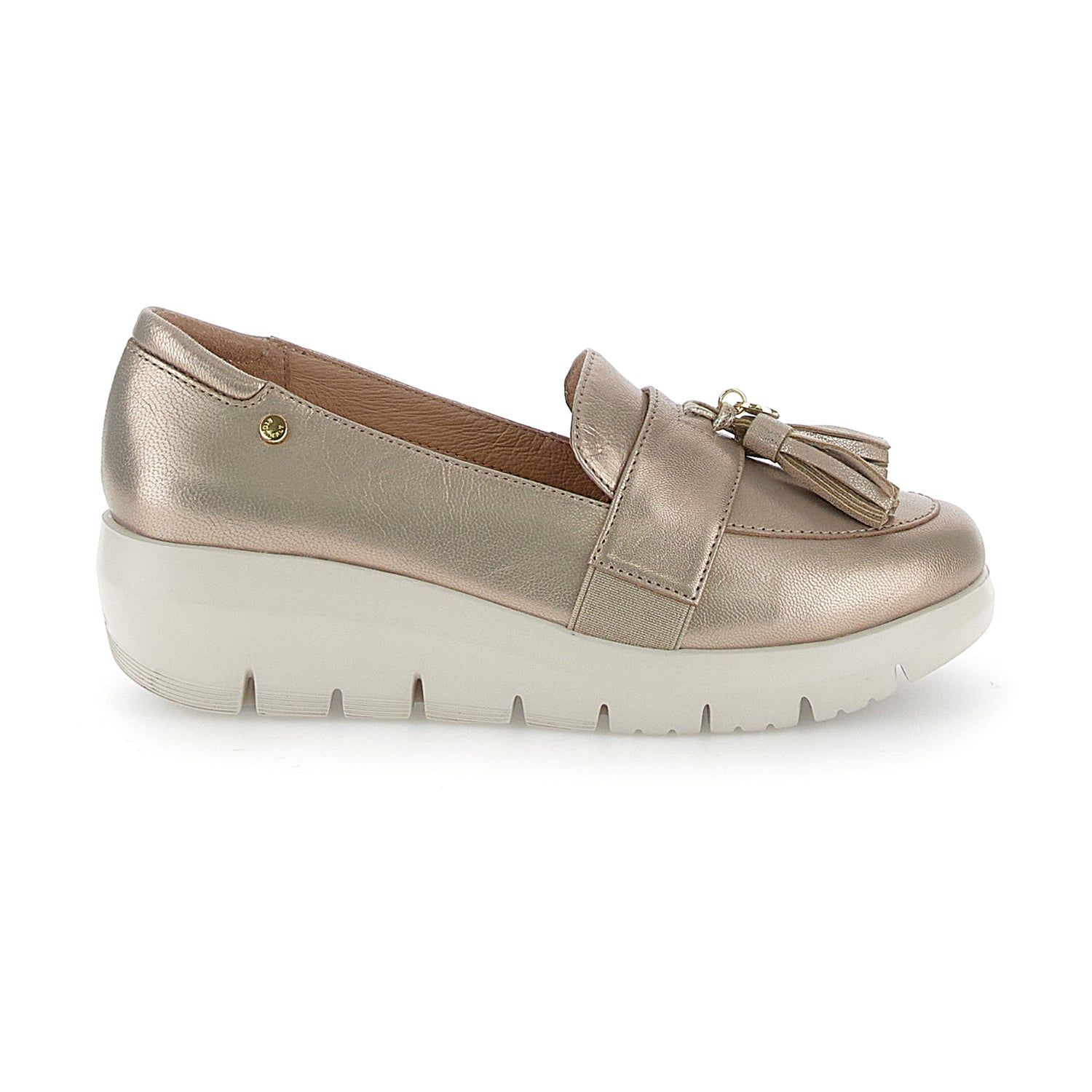 Women's moccasin in gold laminated leather, regular fit. Upper with tassels. All the comfort of the Plume line combined with a classy design, for an impeccable style to wear all day. Blusoft® technology offers soft and light steps like a cat's, with an inimitable level of comfort and cushioning. EVA sole, heel height (cm): 4.5.