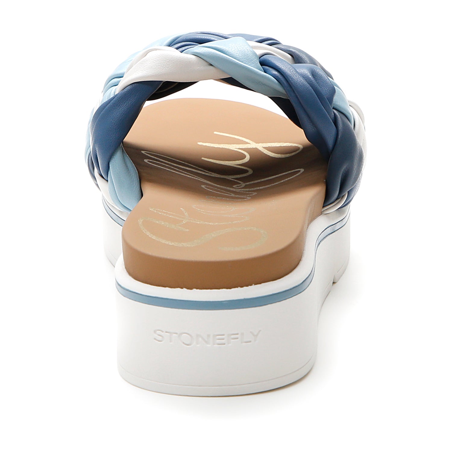 Women's slipper sandal in blue synthetic leather, regular fit. Woven upper and colored profile on the wedge to give a summer touch to your looks. This model is built with Stonefly Second Skin® technology that makes the shoes soft and light, just like a second skin. EVA sole, heel height (cm): 4.5.