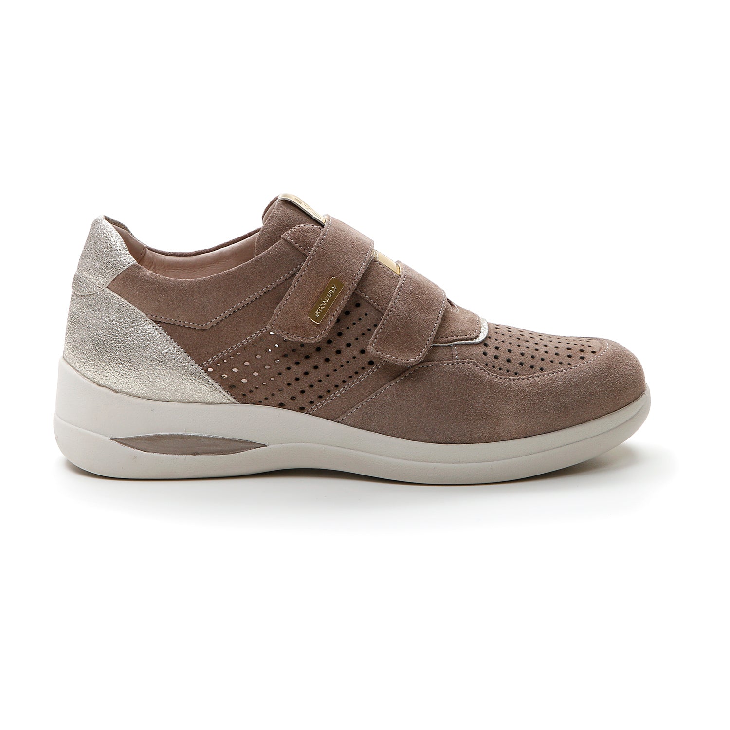 Women's velcro closure shoe in beige velour with a regular fit. Comfortable and lightweight, this model with a perforated upper and metallic inserts is extremely practical and versatile thanks to the velcro closure that makes it easy to wear. Blusoft® technology supports your walk, providing maximum comfort and cushioning. EVA sole, heel height (cm): 4.5.