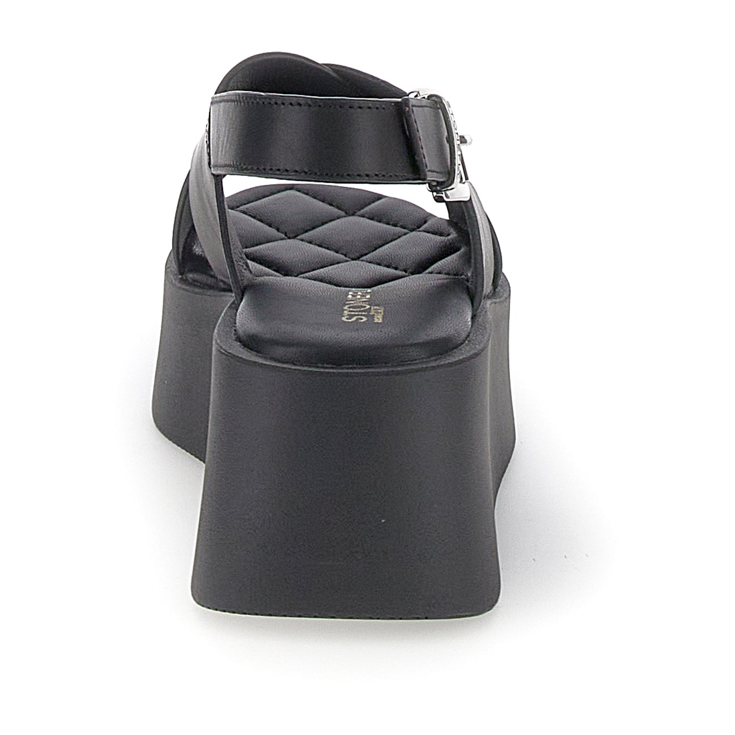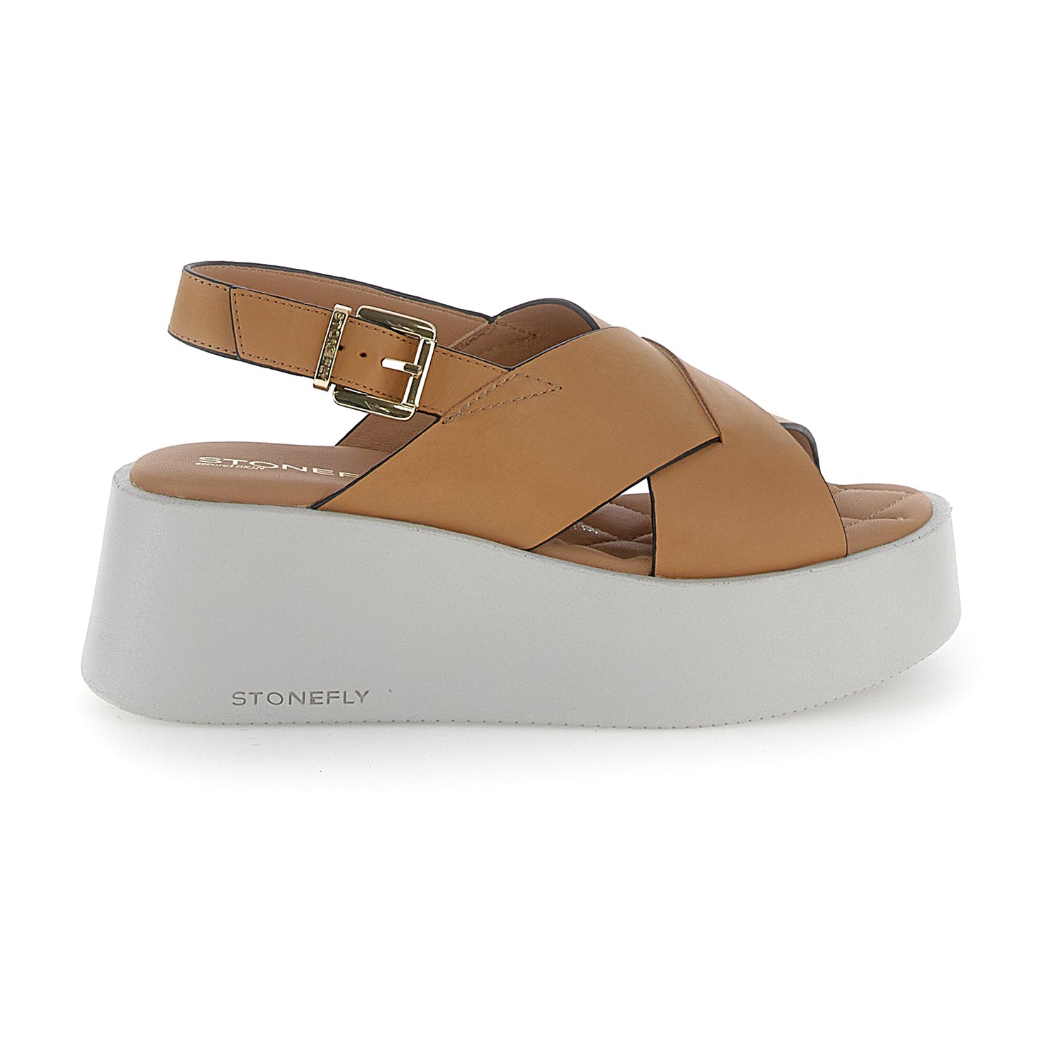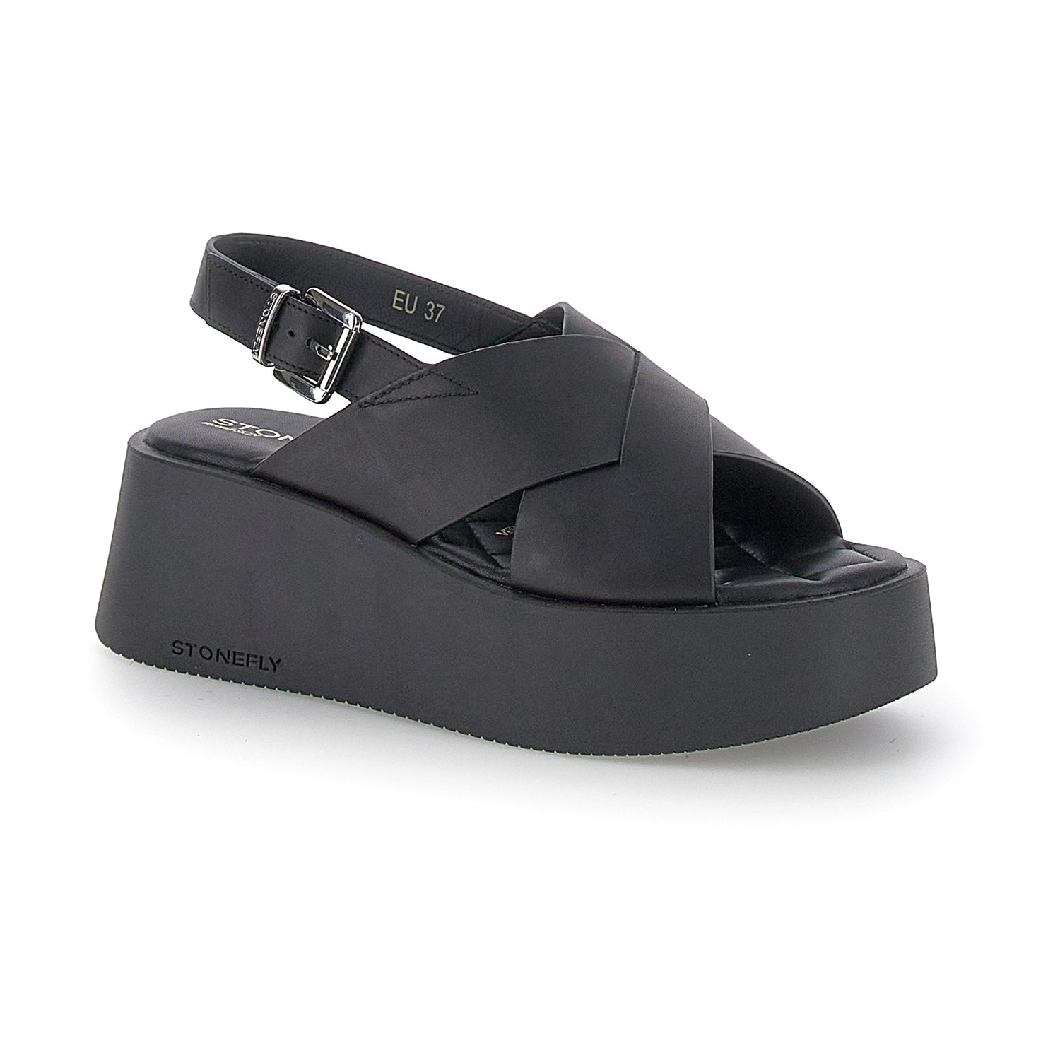 Women's wedge sandal in black leather, regular fit. Comfortable and light, this model represents the perfect choice to complete all your summer outfits, thanks to its crossed and minimal upper and voluminous wedge. This model is built with Stonefly Second Skin® technology that makes the shoes soft and light, just like a second skin. PU sole, heel height (cm): 6.5.