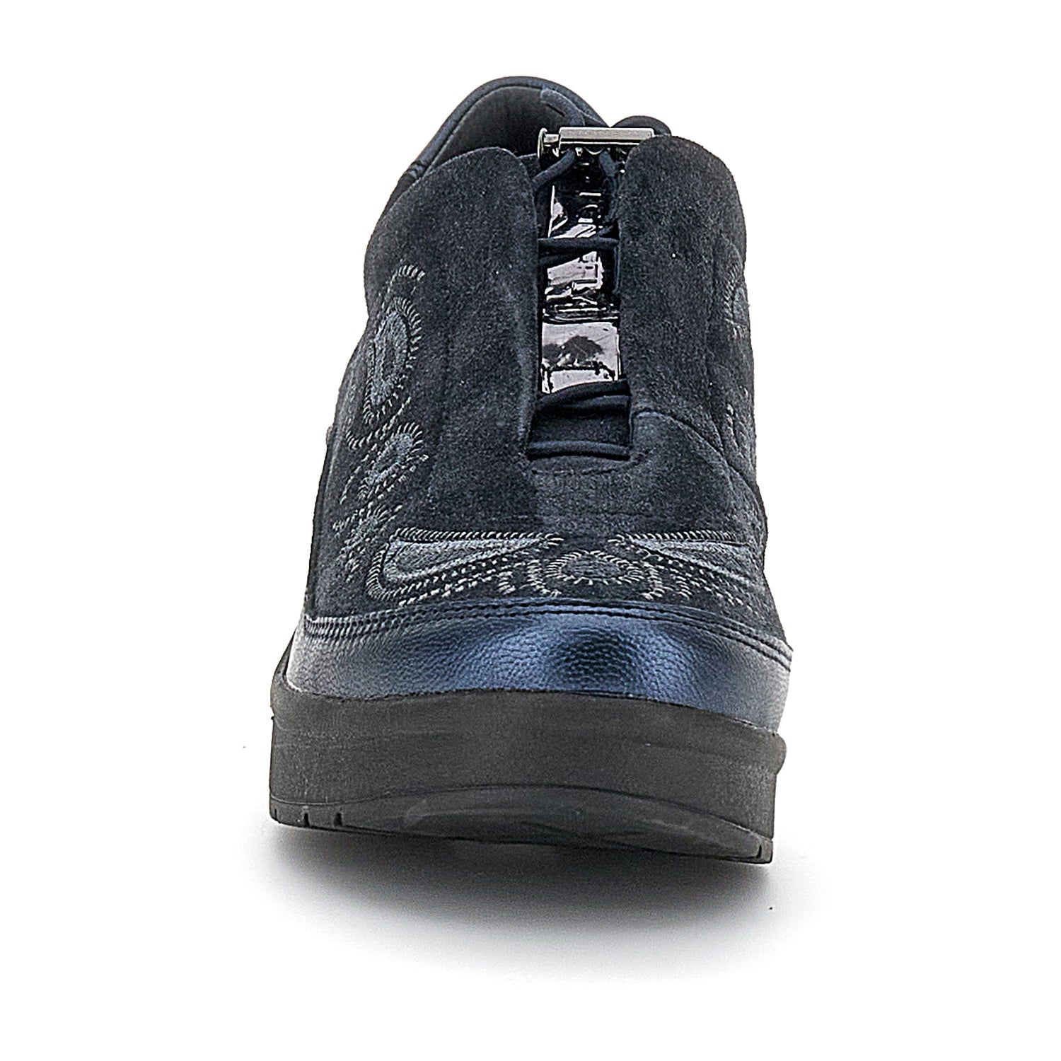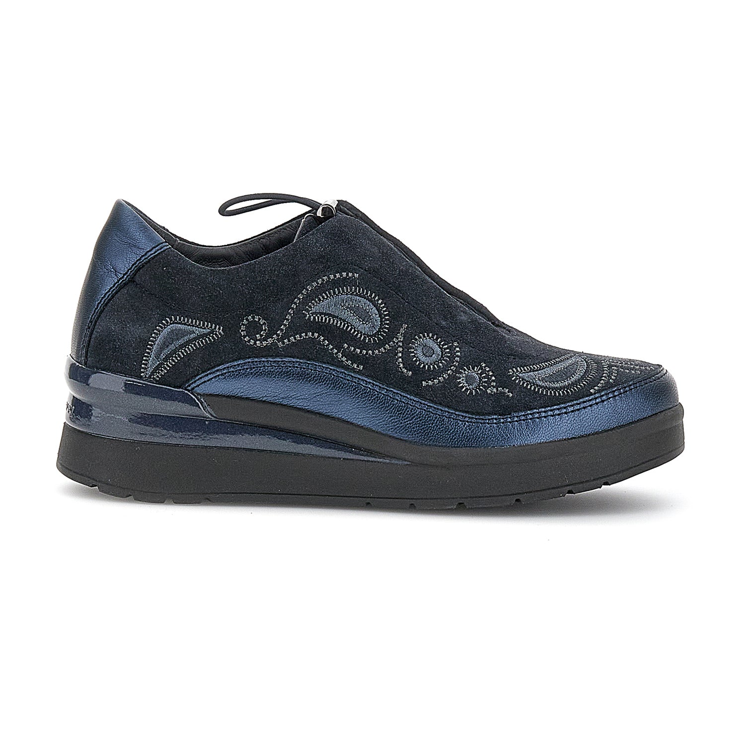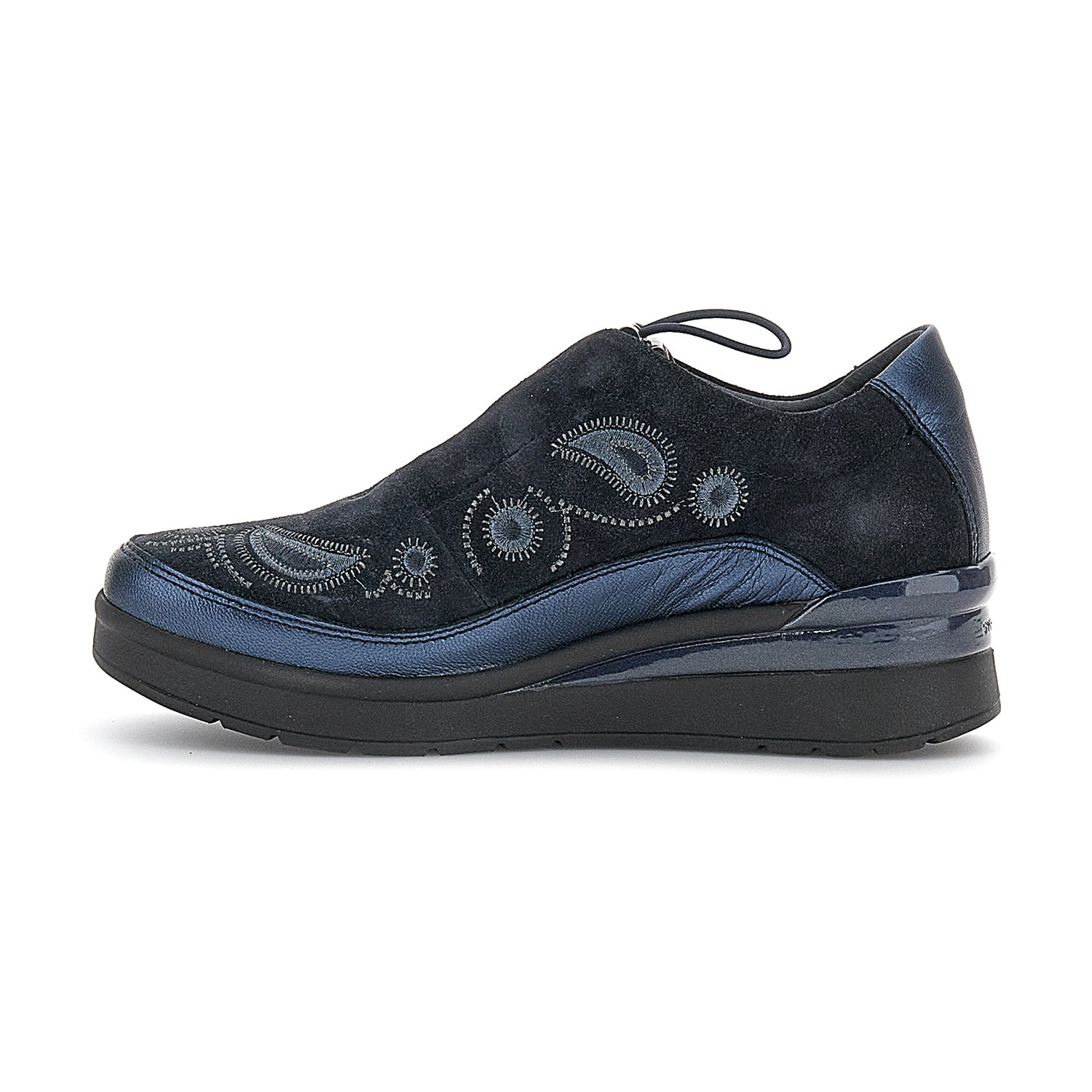 Zapato sin cordones para mujer en piel de terciopelo ante azul con corte regular. Con una parte superior suave adornada con detalles bordados, este modelo sin cordones es extremadamente cómodo y versátil, perfecto para acompañarte con estilo y ligereza en todos tus días. El cierre con cordón hace que sea más fácil y rápido de poner para una máxima comodidad. La tecnología Blusoft® apoya su caminata asegurando la máxima comodidad y amortiguación. Suela de EVA, altura del tacón (cm): 5.