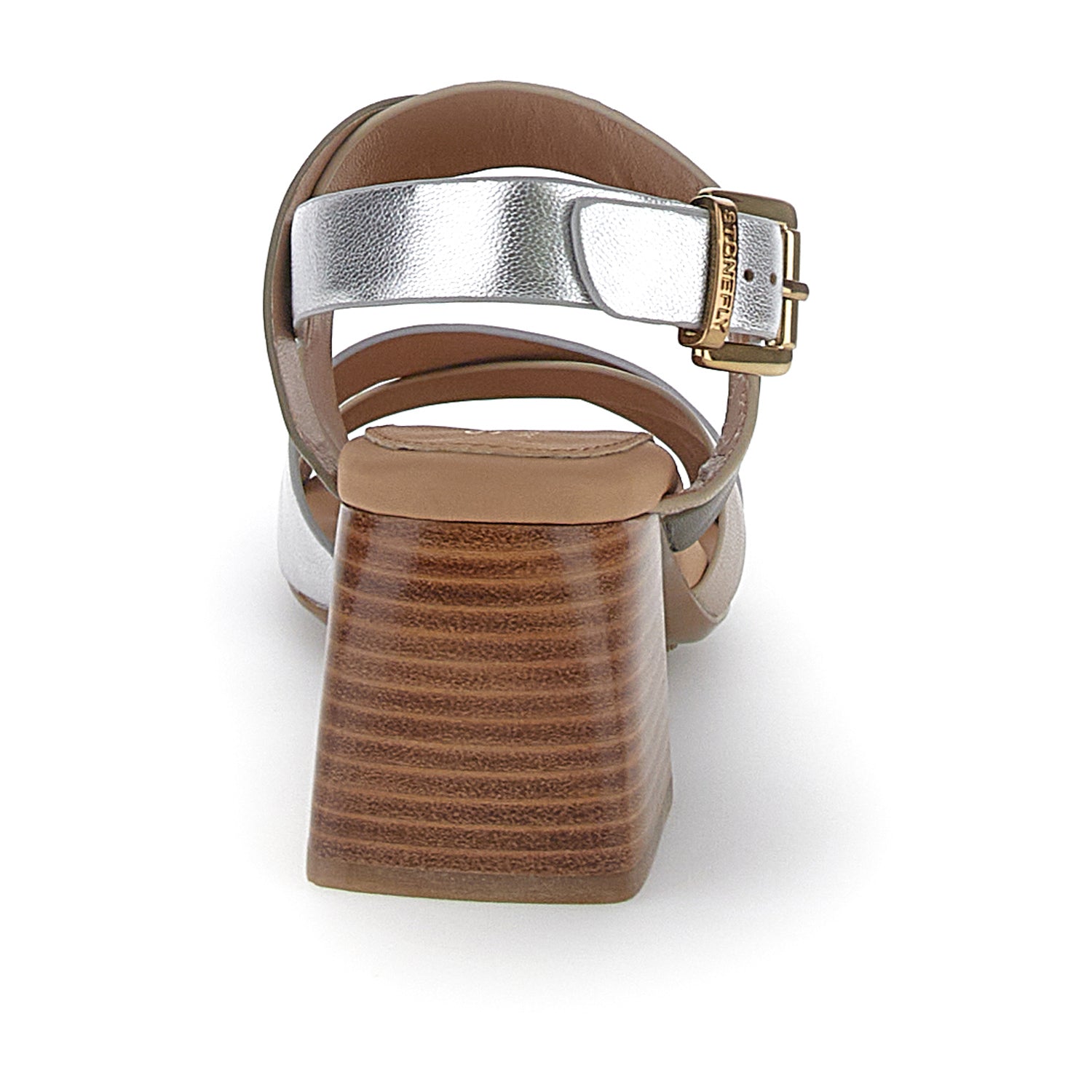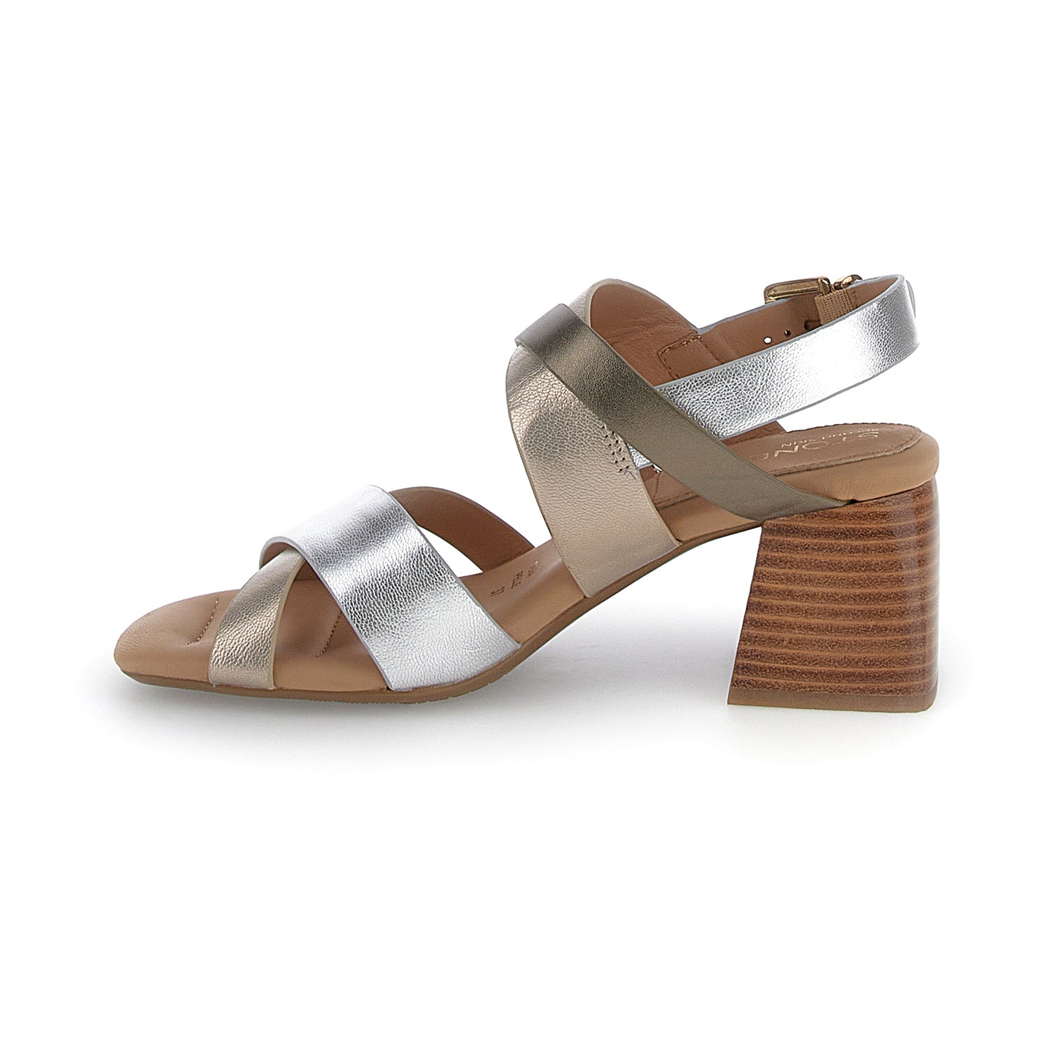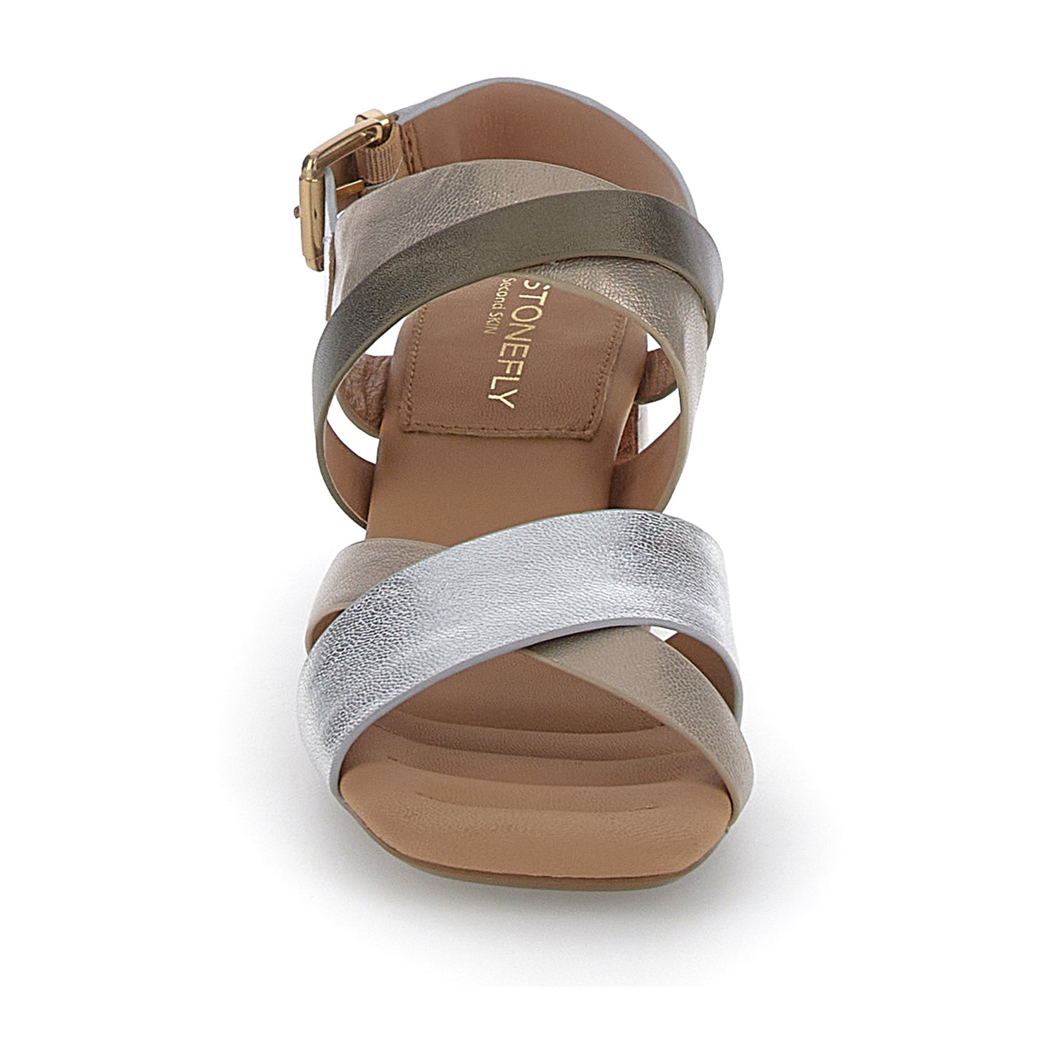 Sandalo con tacco da donna in pelle laminata argento con vestibilità slim. Caratterizzato da una tomaia incrociata che combina diverse nuances di colori metallizzati, è completato da un cinturino alla caviglia regolabile per una calzata perfetta. Il design ricercato del tacco aggiunge un tocco di personalità, rendendolo perfetto per completare con stile qualsiasi look sofisticato. La calzatura incorpora la tecnologia Second Skin® che rende le scarpe morbide e leggere, proprio come indossare una seconda pelle. Suola in PU, altezza tacco (cm): 5.5.