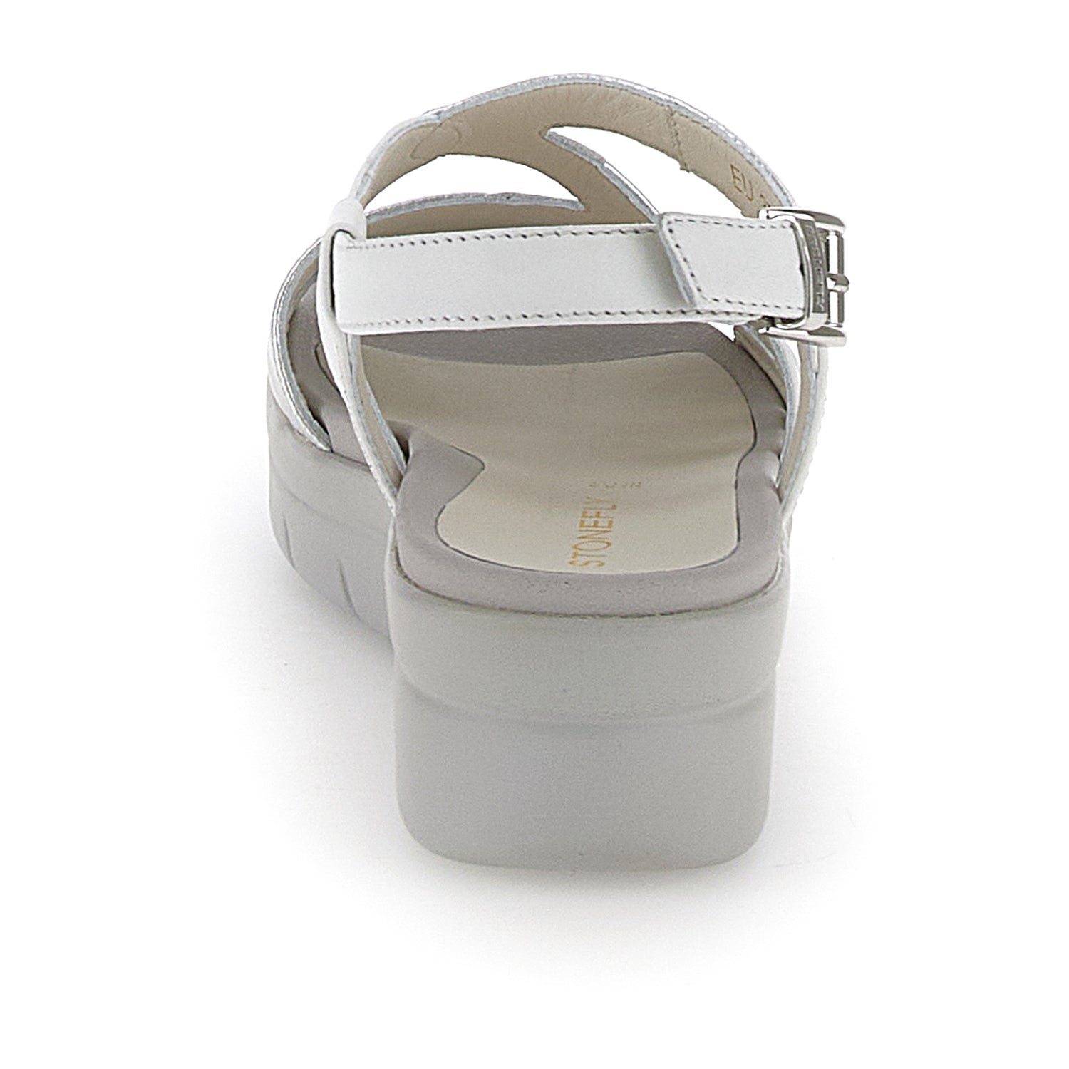 Sandalo con zeppa da donna in pelle nappa e pelle laminata bianca con vestibilità regular. Questo modello con un design della tomaia alla moda e che combina diversi materiali è comodo e leggero, perfetto per completare tutti i tuoi outfit casual chic. La tecnologia Blusoft® supporta la tua camminata garantendo massimo comfort e ammortizzazione. Suola in PU, altezza tacco (cm): 4.5.