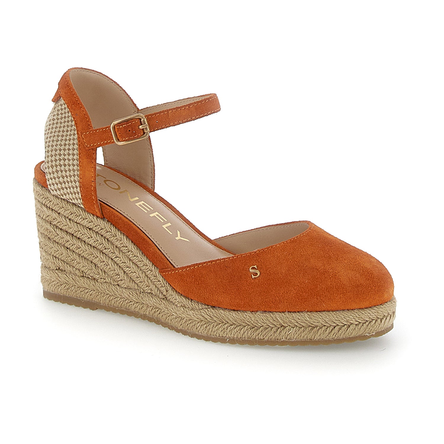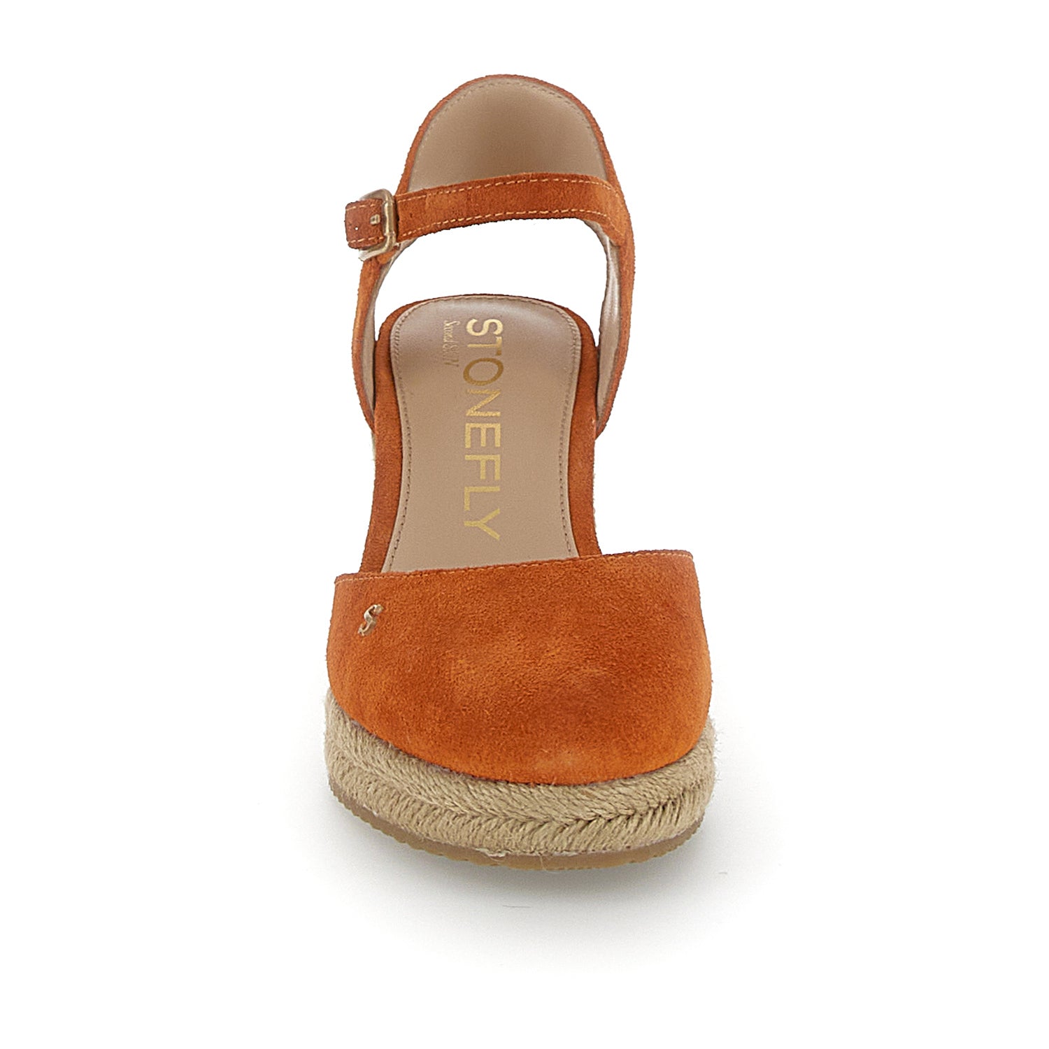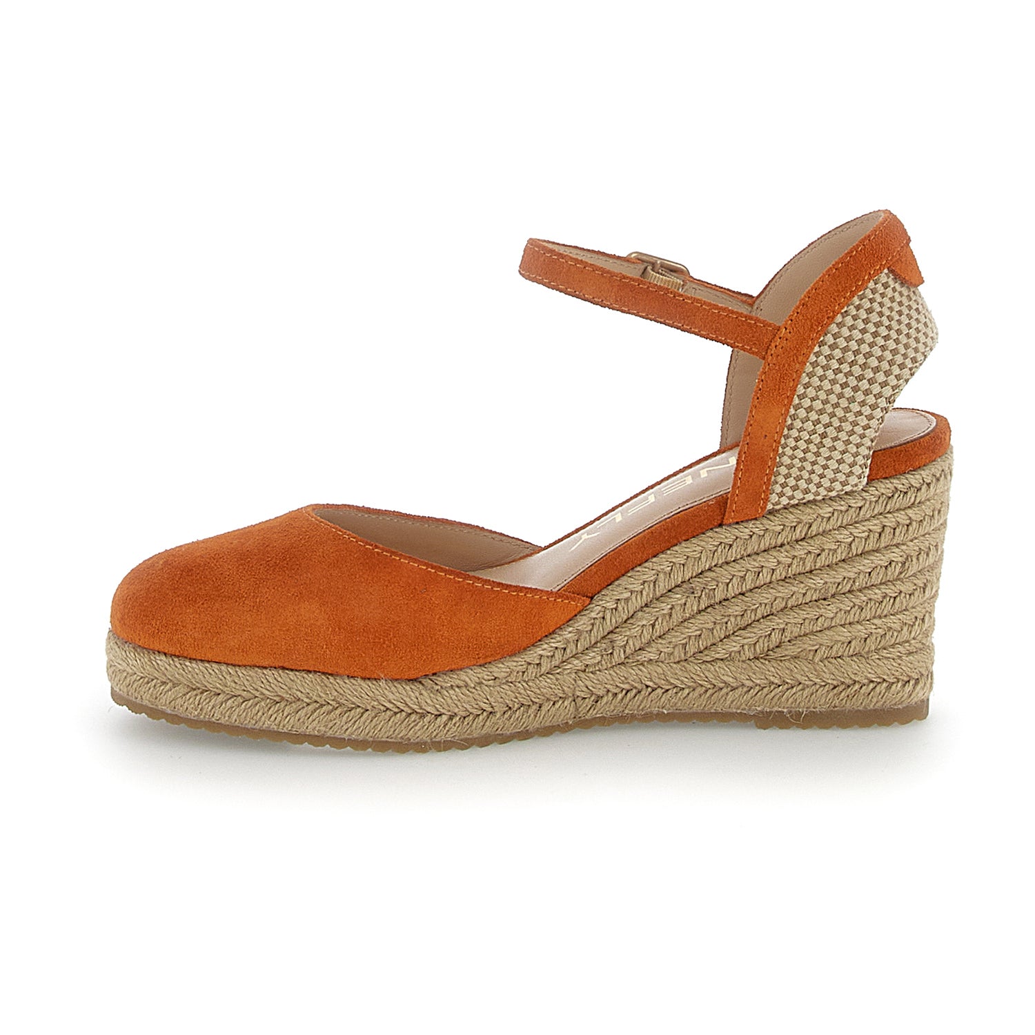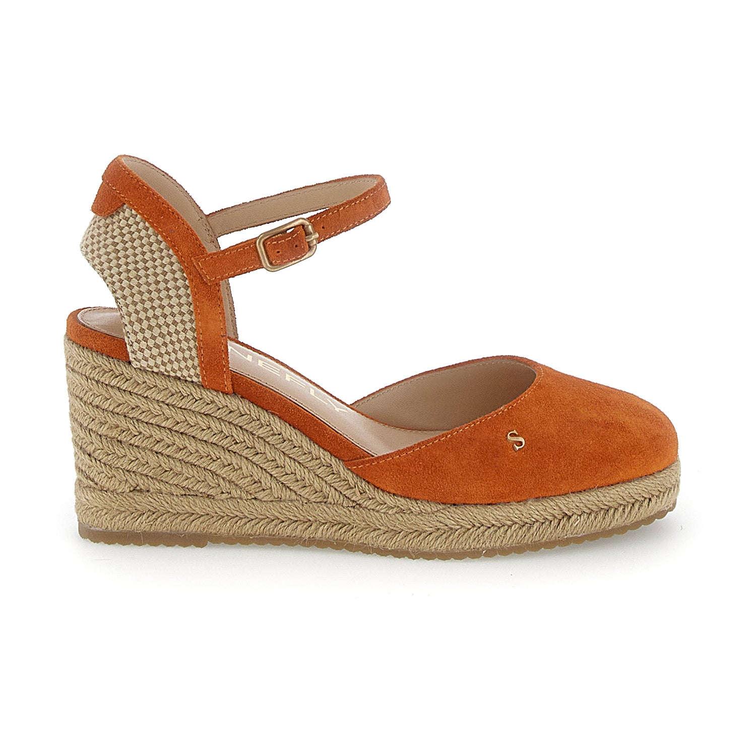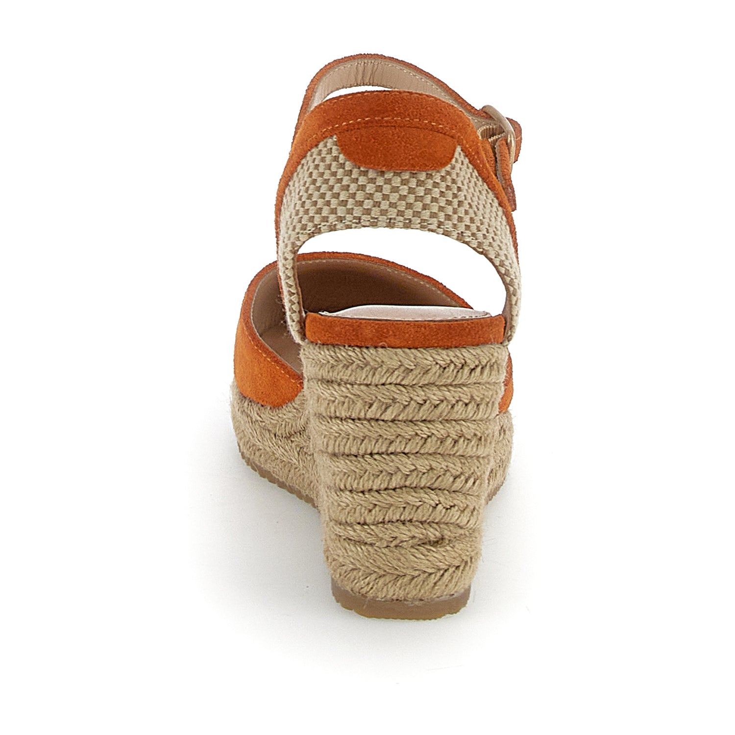 Sandalo con zeppa da donna in pelle velour scamosciata arancio con vestibilità regular. Modello con chiusura a cinturino alla caviglia e dettagli in corda. Comodo, leggero e dal look casual, ma sempre raffinato, perfetto per farti sentire comoda e alla moda in ogni occasione. La calzatura incorpora la tecnologia Second Skin® che rende le scarpe morbide e leggere, proprio come indossare una seconda pelle.