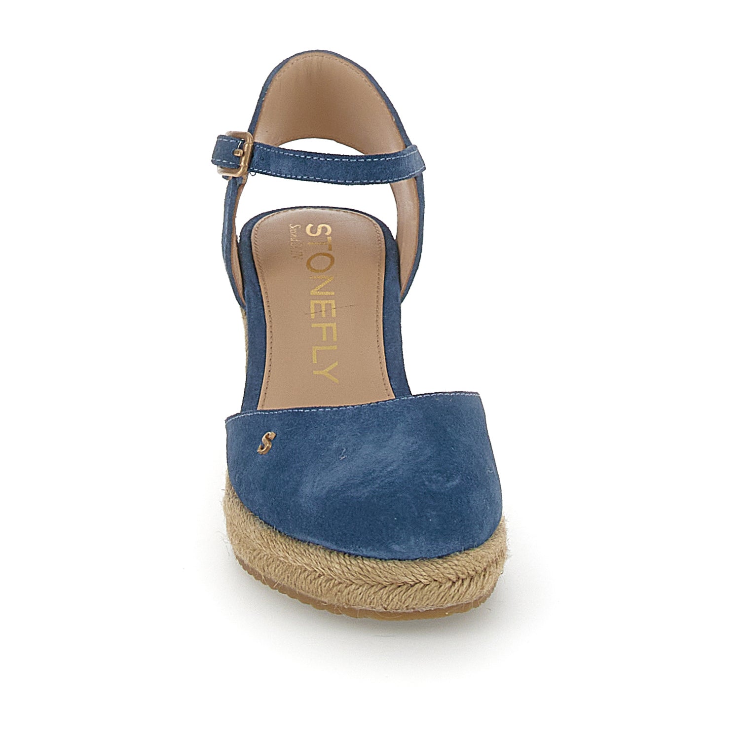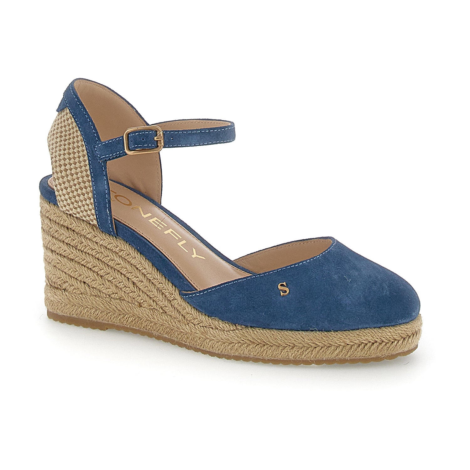 Sandalo con zeppa da donna in pelle velour scamosciata blu con vestibilità regular. Modello con chiusura a cinturino alla caviglia e dettagli in corda. Comodo, leggero e dal look casual, ma sempre raffinato, perfetto per farti sentire comoda e alla moda in ogni occasione. La calzatura incorpora la tecnologia Second Skin® che rende le scarpe morbide e leggere, proprio come indossare una seconda pelle.