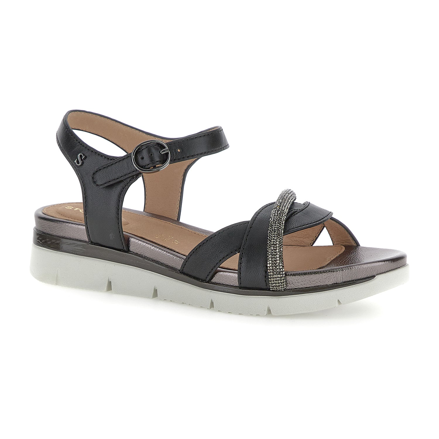 Sandalo senza tacco da donna in pelle nappa nera con vestibilità regular. Questo modello dal design alla moda, impreziosito dall'intreccio e dal dettaglio luminoso della tomaia, è un must-have per il tuo guardaroba, perfetto per essere abbinato a qualsiasi outfit estivo. La tecnologia Blusoft® supporta la tua camminata garantendo massimo comfort e ammortizzazione. Suola in EVA, altezza tacco (cm): 4.