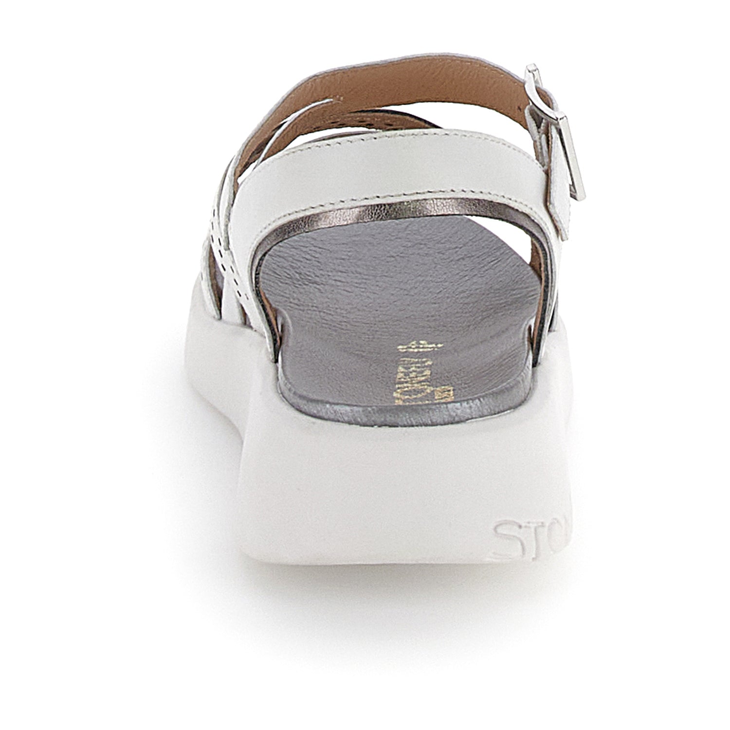 Sandalo senza tacco da donna in pelle nappa bianca con vestibilità regular. Comodo, trendy e versatile, presenta una tomaia traforata, impreziosita da bordi metallizzati. Questo modello leggero e alla moda è perfetto da abbinare ad ogni tuo look estivo. La calzatura incorpora la tecnologia Second Skin® che rende le scarpe morbide e leggere, proprio come indossare una seconda pelle.