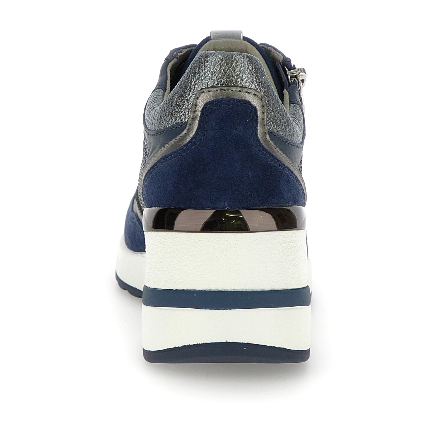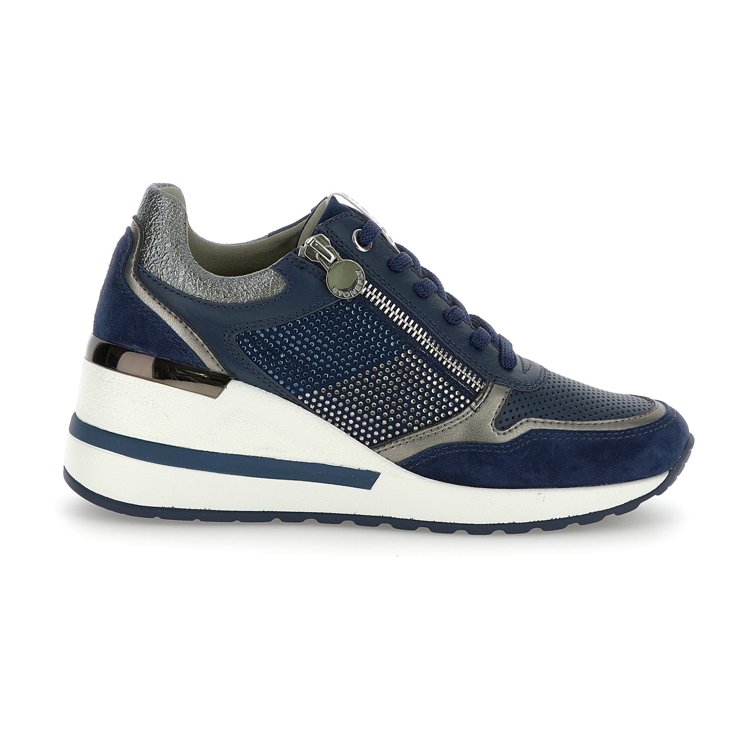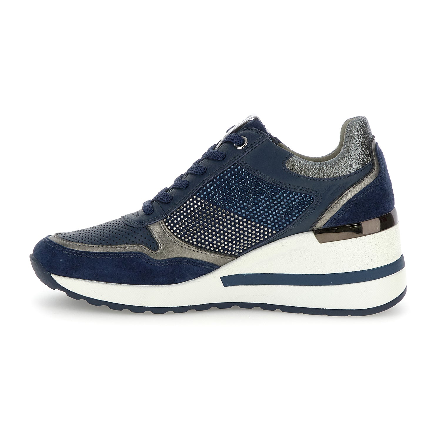 Sneaker da donna in pelle scamosciata e pelle nappa blu con vestibilità slim. Questo modello unisce stile e comfort grazie alla tomaia che combina diversi materiali e finiture, con strass e dettagli metallizzati, e crea un look moderno, ricercato e chic. La zeppa, slanciata ma estremamente comoda, aggiunge un tocco di eleganza, rendendola la scelta perfetta per impreziosire i tuoi outfit di tutti i giorni. La calzatura con Blusoft Memory® ha un particolare plantare estraibile dotato di un inserto in memory foam nell'area del tallone che ammortizza gli urti della camminata. Il plantare è costruito con uno speciale materiale con struttura a cellule aperte che assicura un'altissima traspirabilità. Suola in PU, altezza tacco (cm): 4.