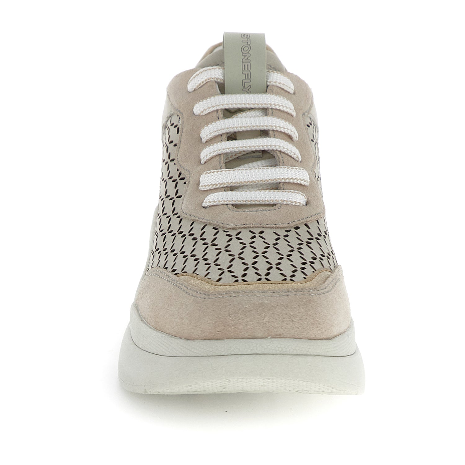Sneaker casual da donna in pelle nappa e pelle velour scamosciata beige con vestibilità regular. Il design moderno è valorizzato dalla tomaia traforata, mentre la suola chunky, morbida e leggera, aggiunge un tocco di carattere e stile urban. Un modello dal look casual chic, perfetto per completare con eleganza e personalità i tuoi outfit di tutti i giorni. La calzatura con Blusoft Memory® ha un particolare plantare estraibile dotato di un inserto in memory foam nell'area del tallone che ammortizza gli urti della camminata. Il plantare è costruito con uno speciale materiale con struttura a cellule aperte che assicura un'altissima traspirabilità. Suola in EVA, altezza tacco (cm): 5.